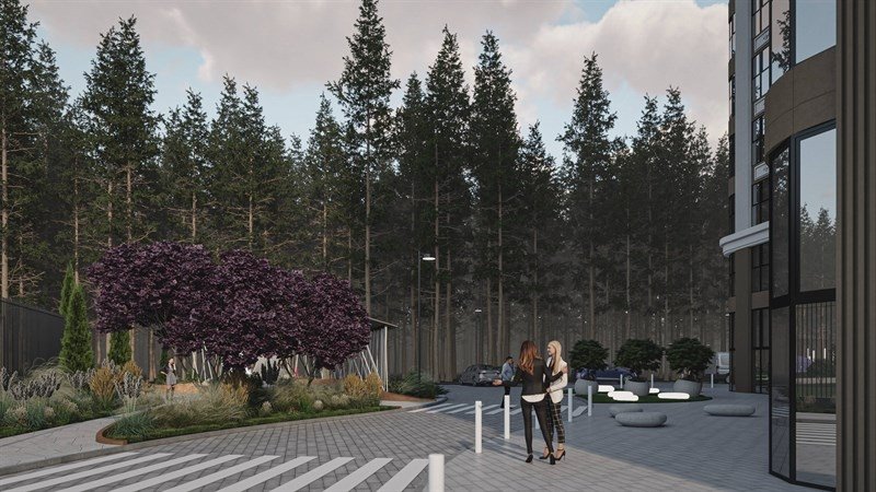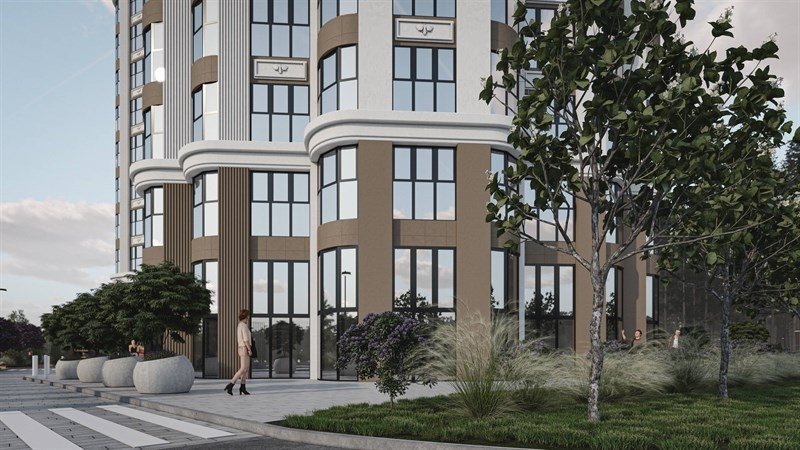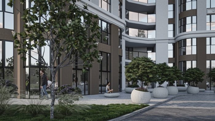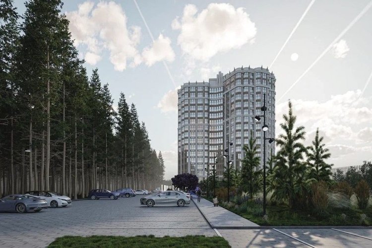 Высотное здание с эффектными панорамными окнами открывает широкие виды на зелёный город и динамичный центр, наполняя квартиры светом и простором.