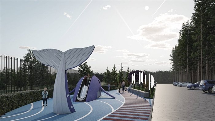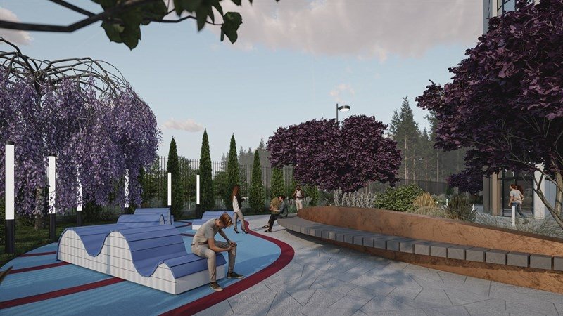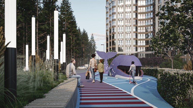 Улица и двор продуманы так, чтобы каждая прогулка среди газонов, цветников и спортивных площадок превращалась в отдых.